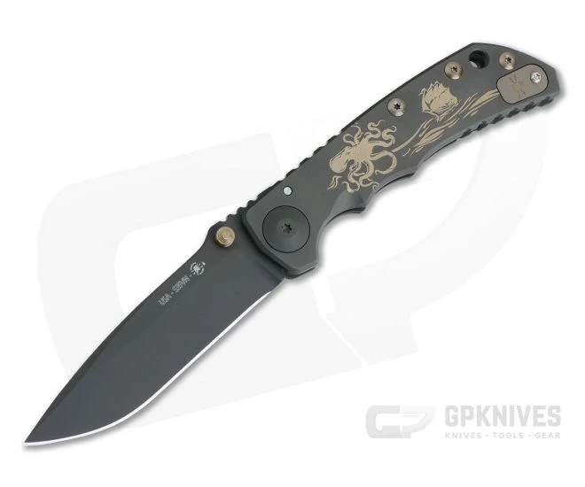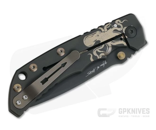 Handle: Â Ergonomic handles have been constructed from black Diamond-Like Carbon coated 6AL4V titanium with gold anodized engraving. The show side has a Kraken, clipper ship and ocean waves engraved on the front along with a “Spartan” engraved clip insert, all anodized gold. On the reverse side is engraved is a closeup of the Kraken on its own. Gold anodized titanium barrel spacers, hardware and a black PVD coated, oversize pivot bring the two pieces together. The back titanium slab forms an integral frame lock mechanism for reliable lock-up in hard use conditions with internal lock-bar stabilizer.