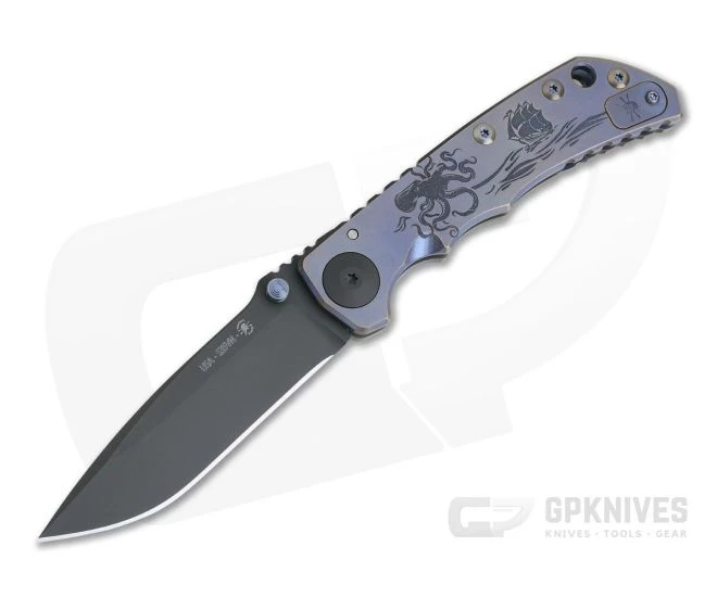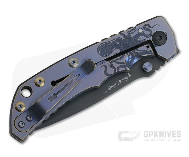 Handle: Â Ergonomic handles have been constructed from finely brushed 6AL4V titanium with blue and bronze anodization and detailed engraving. The show side has a Kraken, clipper ship and ocean waves engraved on the front along with a “Spartan” engraved clip insert. On the reverse side is engraved is a closeup of the Kraken on its own. Two-tone blue and bronze anodized titanium barrel spacers, hardware and a black PVD coated, oversize pivot bring the two pieces together. The back titanium slab forms an integral frame lock mechanism for reliable lock-up in hard use conditions with internal lock-bar stabilizer.