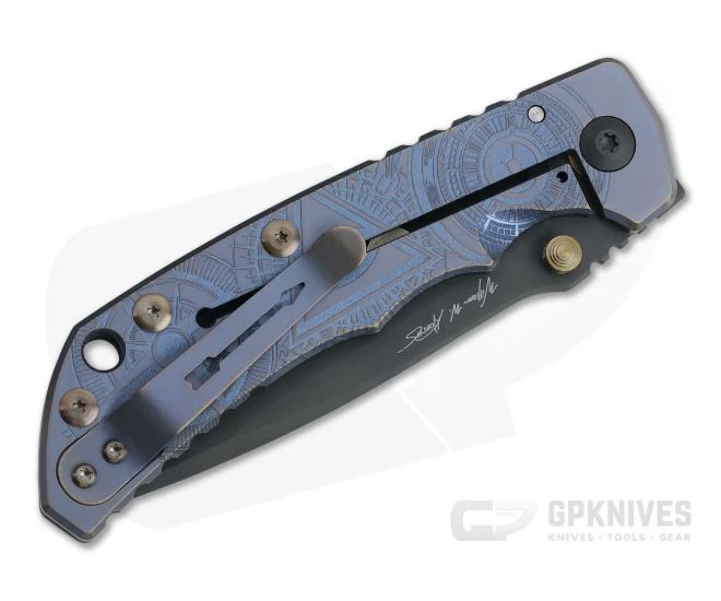 Handle: Â Ergonomic handles have been constructed from 6AL4V titanium and anodized with detailed engraving. Both front and back feature a two-tone, blue-bronze anodized finish with deep engraved graphics of a clock, the Eye of Providence and a compass rose. Bronze screws and spacers and a black DLC finished, oversized pivot complete the construction. The back titanium slab forms an integral frame lock mechanism for reliable lock-up in hard use conditions with internal lock-bar stabilizer.