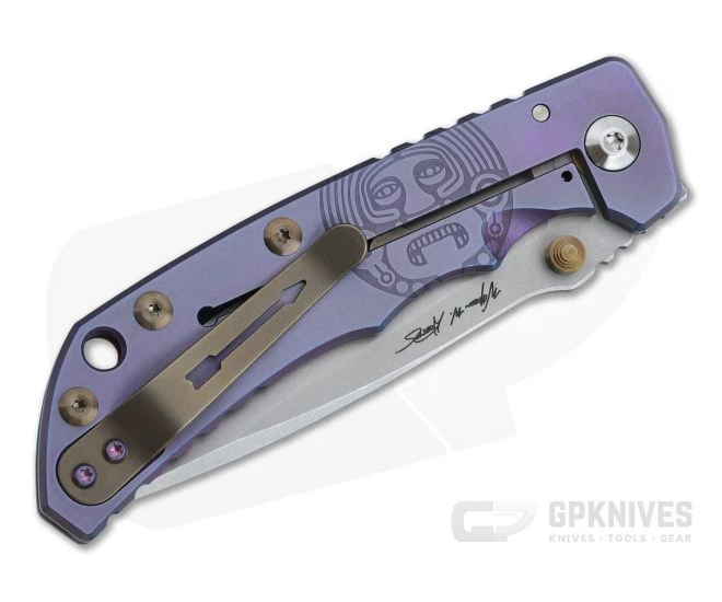 Handle:Â Ergonomic handles have been constructed from brushed 6AL4V titanium which have been anodized purple adorned with highly detailed engravings. The show side has a full coverage, Mayan Calendar engraved in fine detail with two Fire Stone jewels and an anodized “Spartan” engraved clip insert. On the reverse side is a Mayan head glyph. Bronze anodized titanium barrel spacers, hardware and a satin finished, oversize pivot bring the two pieces together. The back titanium slab forms an integral frame lock mechanism for reliable lock-up in hard use conditions with internal lock-bar stabilizer.
