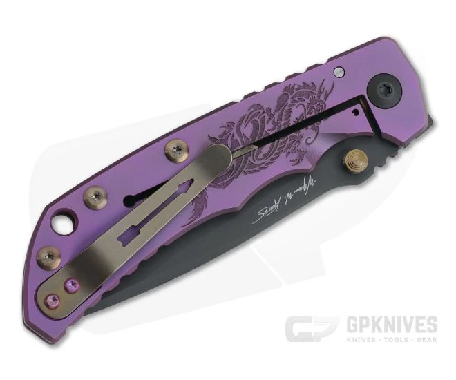 Handle: Ergonomic handles have been constructed from 6AL4V titanium and anodized with detailed engraving. Both front and back feature a purple anodized finish with Dragon engravings. Bronze screws and spacers and a black DLC finished, oversized pivot complete the construction. The back titanium slab forms an integral frame lock mechanism for reliable lock-up in hard use conditions with internal lock-bar stabilizer.