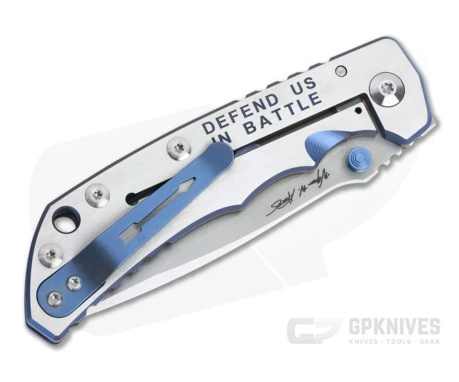 Handle: Ergonomic handles have been constructed from satin finished 6AL4V titanium which have been adorned with highly detailed, blue anodized engravings. The show side has a large coverage representation of Saint Michael the Archangel, patron Saint of the Airborne and Infantry, slaying the dragon engraved in fine detail and anodized blue. The front also features a satin finished “Spartan” engraved clip insert. On the reverse side is a matching engraving of a prayer to St. Michael: “Defend Us In Battle”. Blue anodized titanium barrel spacers, hardware and a satin finished, oversize pivot bring the two pieces together. The back titanium slab forms an integral frame lock mechanism for reliable lock-up in hard use conditions with internal lock-bar stabilizer.