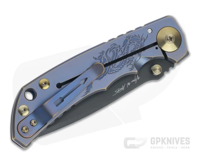 Handle: Ergonomic handles have been constructed from blue/bronze anodize finished 6AL4V titanium with deep engraved graphics along with a Spartan engraved clip insert. Anodized titanium barrel spacers, handle screws and custom pivot complete the construction. The back titanium slab forms an integral frame lock mechanism for reliable lock-up in hard use conditions with oversized pivot lockbar stabilizer.