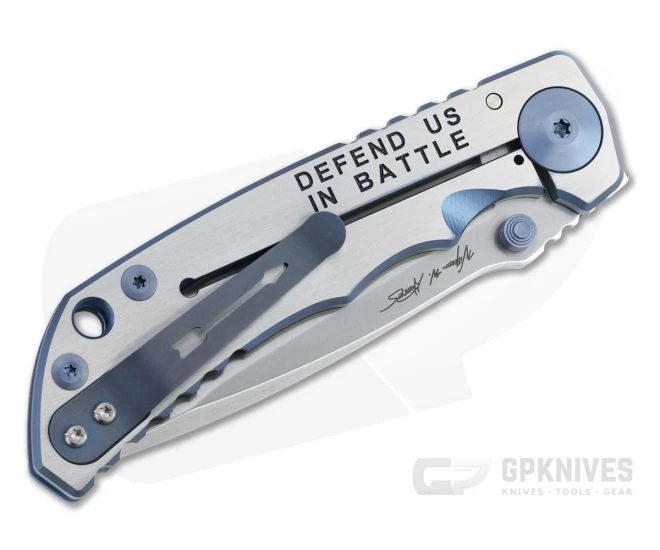 Handle: Ergonomic handles have been constructed from satin finished 6AL4V titanium with blue anodized edges and deep engraved graphics along with a Spartan engraved clip insert. Titanium barrel spacers, handle screws and custom pivot complete the construction. The back titanium slab forms an integral frame lock mechanism for reliable lock-up in hard use conditions with internal lock-bar stabilizer. Thumb studs and clip are anodized blue to match the engravings.