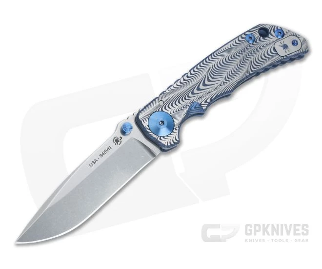 Blade: A classic, utilitarian drop point blade is made from CPM-S45VN with a top swedge and high saber grind for balanced performance and durability. Stonewashed for a rugged look that will hide everyday wear. Riding on reliable bronze washers the blade deploys fast and smooth via dual blue titanium thumb studs. Aggressive jimping on the thumb ramp offers added traction and a point for indexing.