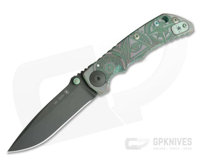 Handle: Ergonomic handles have been constructed from 6AL4V titanium and finished with variegated green over bronze anodization . Both sides of the handle feature deep engraved graphics of a clock, the Eye of Providence and a compass rose along with a Spartan engraved clip insert. Green anodized barrel spacers and handle screws and a Black DLC coated pivot bring the two pieces together. The back titanium slab forms an integral frame lock mechanism for reliable lock-up in hard use conditions with internal lock-bar stabilizer.
