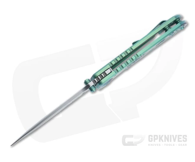 Handle: Ergonomic handles have been constructed from finely brushed satin 6AL4V titanium with detailed engraving. The show side has a green Kraken, clipper ship and ocean waves engraved on the front along with a “Spartan” engraved clip insert. On the reverse side engraved is a closeup of the Kraken on its own. Green anodized titanium barrel spacers, hardware and oversize pivot bring the two pieces together. The back titanium slab forms an integral frame lock mechanism for reliable lock-up in hard use conditions with oversized pivot lockbar stabilizer.
