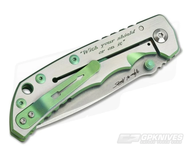 Handle: Ergonomic handles have been constructed from 6AL4V titanium and satin finished with green anodized edges. The show side has an engraved Spartan warrior with inset Jewel shield centered within a detailed, circular Greek motif, anodized green, along with a satin finished, Spartan engraved clip insert. The reverse side is engraved “With your shield or on it.”. Green anodized titanium barrel spacers, hardware and satin finished, oversize pivot bring the two pieces together. The back titanium slab forms an integral frame lock mechanism for reliable lock-up in hard use conditions with internal lock-bar stabilizer.