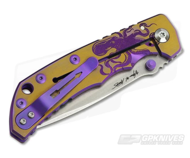 Handle: Ergonomic handles have been constructed from 6AL4V titanium and gold anodized with anodized purple engraving and edges. The show side has a Kraken, clipper ship and ocean waves engraved on the front along with a “Spartan” engraved clip insert, all anodized purple on brushed satin, gold anodized flats. Matching anodized titanium barrel spacers, hardware and satin finished oversize pivot bring the two pieces together. The back titanium slab forms an integral frame lock mechanism for reliable lock-up in hard use conditions with internal lock-bar stabilizer.