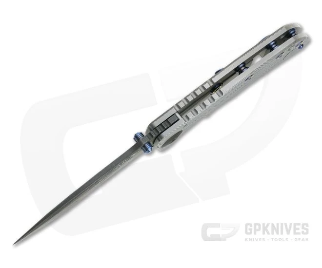 Blade: A traditional drop point style blade has dual titanium thumb studs making opening from either side a breeze. Bronze washers construction at pivot delivers smooth operation of the blade with zero play. Chad Nichols Stainless Damascus steel delivers modern performance with a striking and unique visual appeal for this custom, tactical folder. Jimping along the thumb ramp adds traction for serious use.