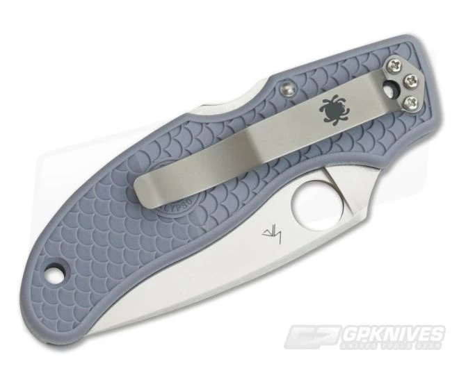 The Handle: In keeping with the Super Blue Sprints of the past the Calypso Jr. has a gray FRN handle with the original ‘Fish Scale’ pattern texturing for both visual appeal and traction in hand. A Boye Dent equipped Mid-Back Lock delivers solid and secure lock up and an original Spyderco 3-Hole clip is set up for reversible, tip-down carry making the Calypso Jr. fully ambidextrous.