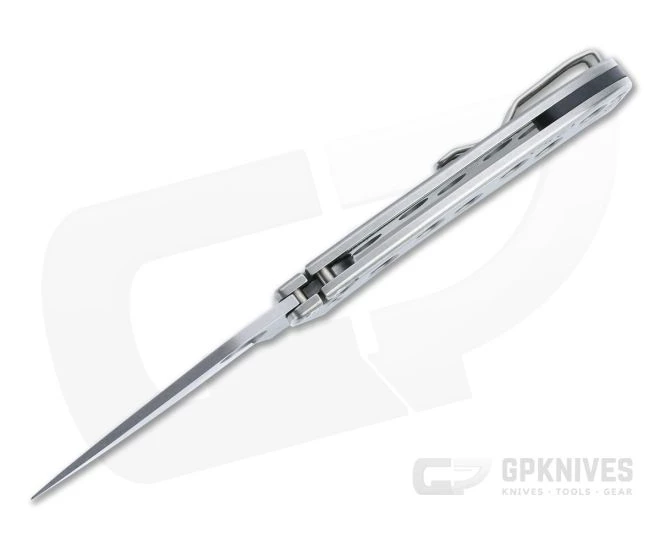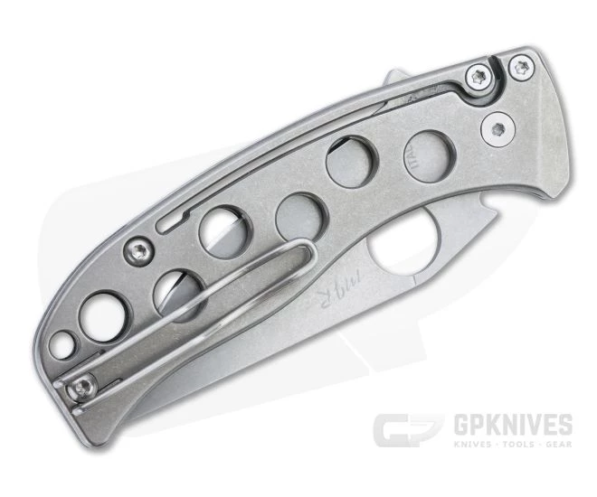 Handle: Machined titanium slabs are milled with six large holes in a zigzag pattern for weight reduction and traction. All edges are chamfered for comfort. Joined in an open construction with partial back spacer the slabs are cut to form an integral back spring. The spring paired with a hardened pin forms a unique slip joint mechanism that is stronger the stronger it is gripped. Unlike traditional solid spring designs, this also allows for the knife to have a forward finger guard for added safety.