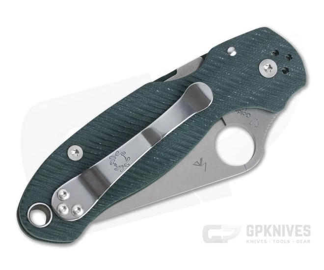 Handle: Diamond Arc textured, Forest Green G10 handle scales are lightweight, durable and nearly impervious to the elements. Nested in the scales are skeletonized stainless steel liners which create the foundation of Spyderco’s patented Compression Lock mechanism. The Compression lock is exceptional strong while being lightweight and allows for safe closing of the knife without putting your fingers in the path of the blade. Open back standoff construction provides easy access for cleaning and maintenance with a generous hollow tube for lanyard attachment.