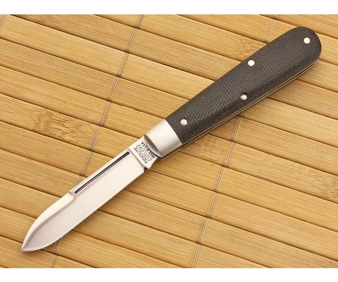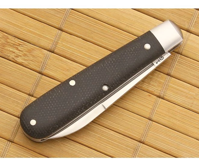The Handle: Black Canvas Micarta handle scales have slight texture, rugged good looks and are attached with all-stainless construction. The edges are smooth, flush and rounded near the bottom giving this Boys Knife a very traditional feel. Brushed Satin stainless bolsters, liners and pins with no logos or shield necessary classic design.