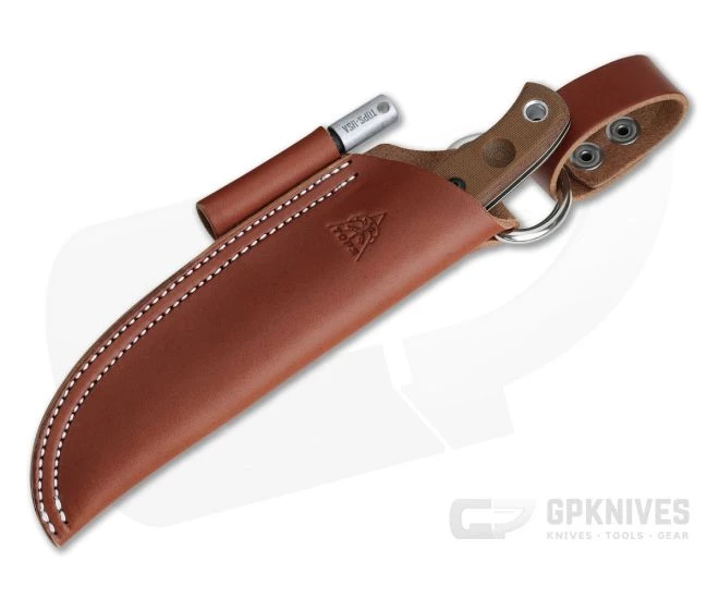 Sheath: Carries via a double-stitched, brown leather belt sheath with drop loop and Ferro rod (included) holder.