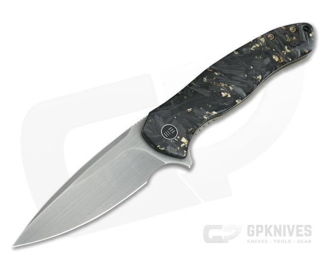 Named after a small, sleek, deep-sea dwelling shark, the WE Knives Kitefin has many of the same qualities as its namesake and makes for an excellent choice for a gentleman’s everyday carry folder while offering good utility to handle your daily cutting tasks. Robust, integral titanium frame lock construction and a premium stainless steel blade deliver practical performance on this stylishly simple design. This Limited Edition version comes with a hand rubbed satin CPM-20CV blade, gold shred carbon fiber resin front scale and tumbled bronze anodized titanium frame.