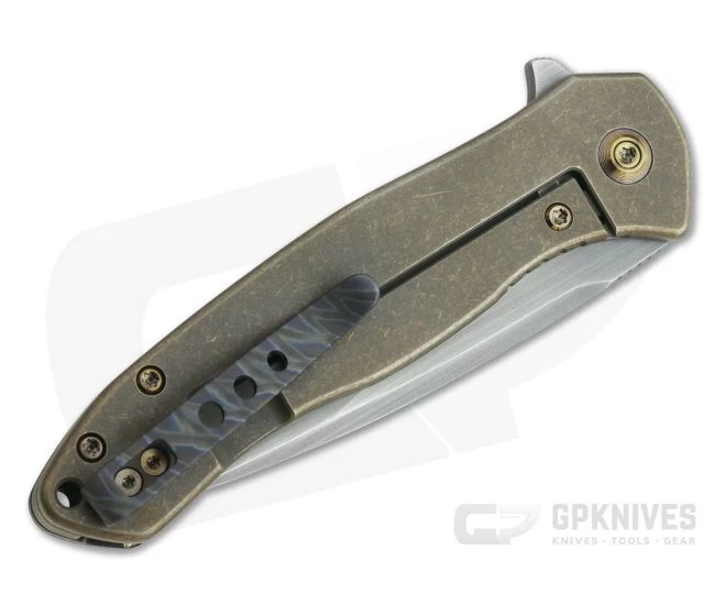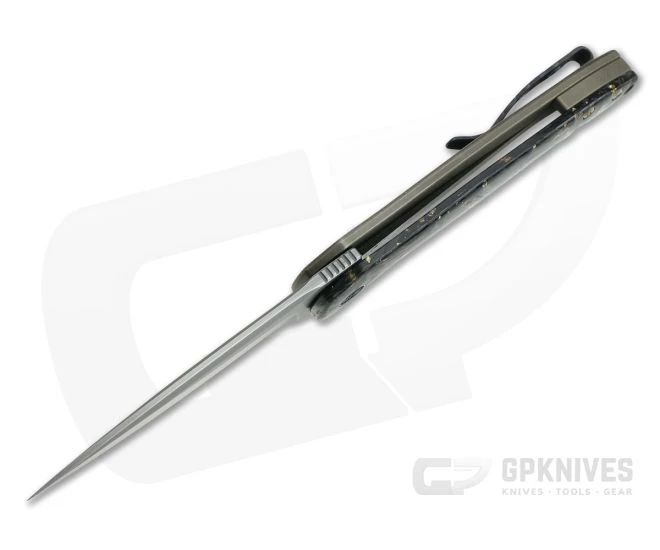 Handle: On the front a titanium liner supports a sleek and stylish gold and carbon fiber shred resin scale for striking visual appeal and comfort in the hand. The back is a solid slab of titanium milled with an integral frame lock and steel lock face insert for smooth, reliable and secure lockup for the life of the knife. Liner, frame and back spacer are tumbled bronze anodized titanium assembled with matching bronze anodized titanium hardware. A slim, elegant and ergonomic design fits as well in the pocket as it does in the hand.