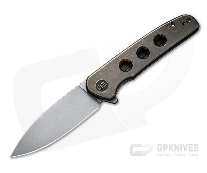 The Shakan flipper is a limited run design from WE Knives offering high-end performance with dress carry style and precision fit and finish making it a jewel in any collection. This version comes with a gray stonewashed CPM-20CV blade and tumbled bronze titanium handles with hole milled presentation side. Limited edition of 210 pieces.