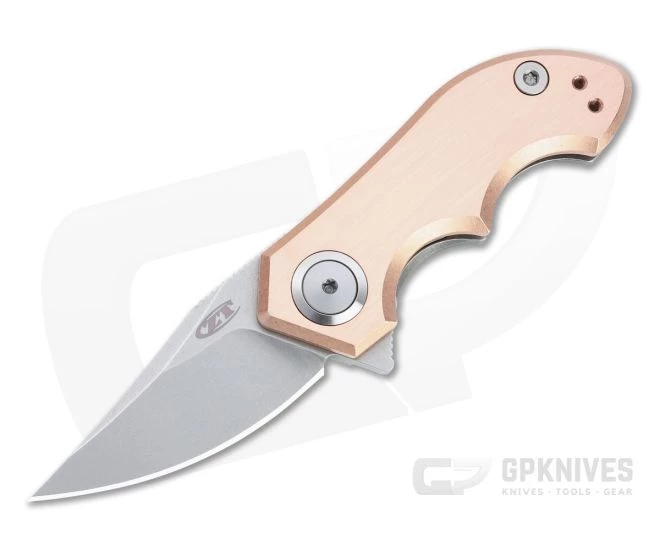 Designed by Tim Galyean the Zero Tolerance 0022 is a compact, high performance flipper ideally suited to office, dress and daily carry. The 0022CU brings this bantam folder to market as a Factory Special Series limited production run with a stonewashed CPM-20CV blade, matching titanium frame, sliver hardware and brushed raw copper front.